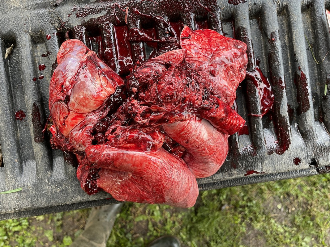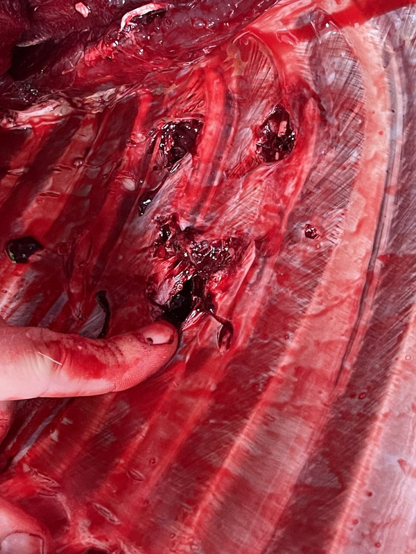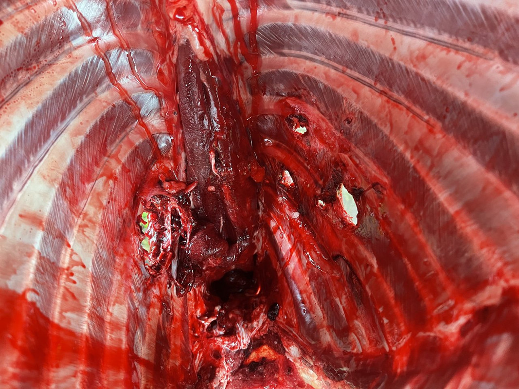 Bullet exited, leaving a good plume of lung and blood.