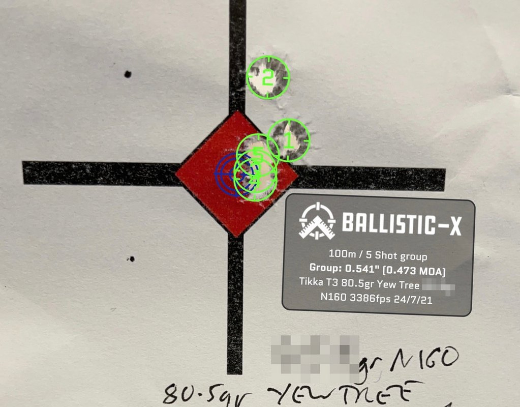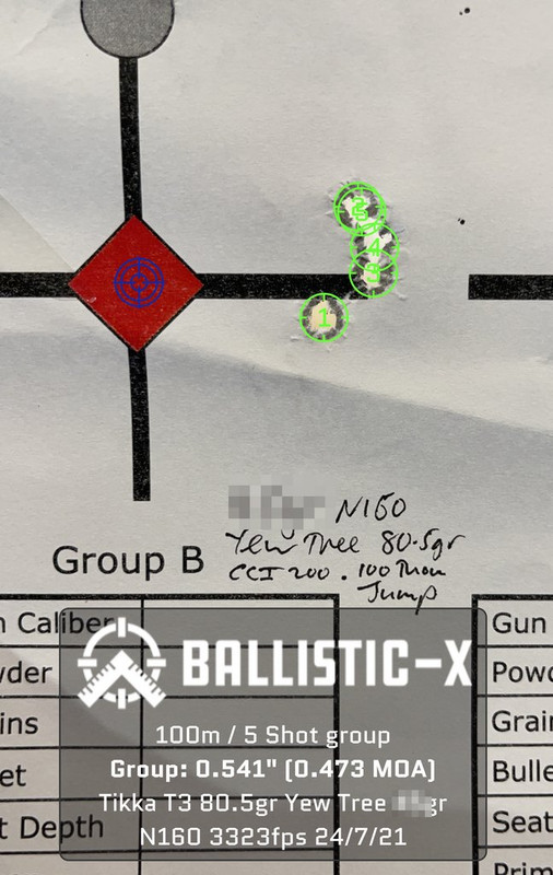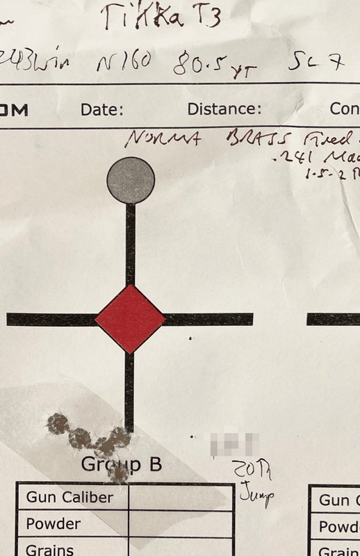 Given the increasing trend toward non-toxic bullets, I wanted such an option in 243Win. Accordingly I developed a load using Vit N160 and the 80.5gr Yew Tree bullet. MV is 3375fps NB. this 24"barrel rifle's throat is quite long and at 20thou jump I generally get high velocities without pressure problems so this isn't an MV to chase in other rifles. I had expected to use a long jump with copper But it was very jump-tolerant giving sub 0.5MOA 5 shot groups with jumps from 20 and 100thou: